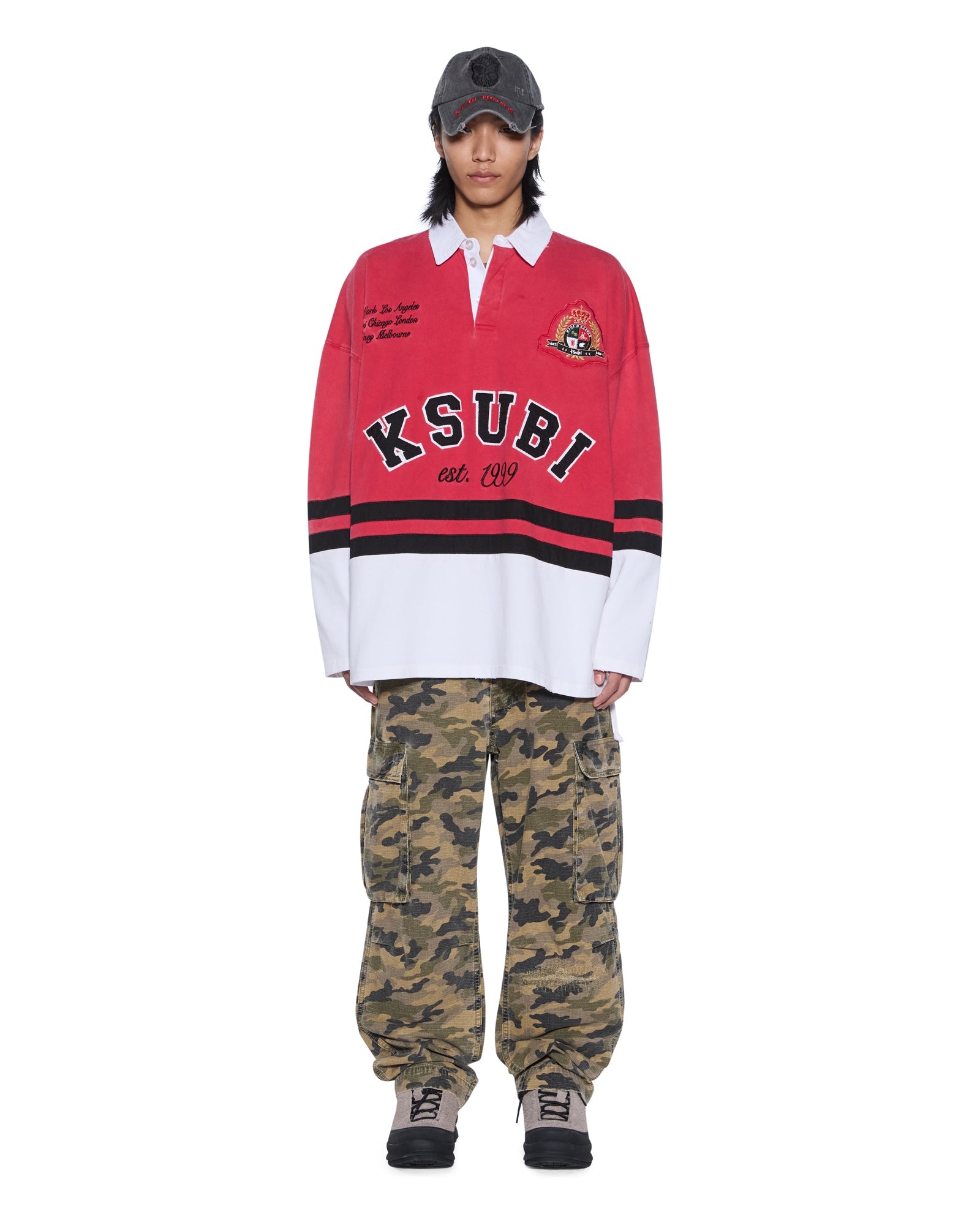 The Duke Rugby LS Jersey Red is an oversized long-sleeve rugby top with a quarter neck button placket and a contrast cotton twill collar. Crafted from a heavyweight red-and-white rugby jersey, it features appliquŽ design lines, multi-textural artwork and is finished with signature T-box and 4x4 embroidery and Ksubi branded hardware.