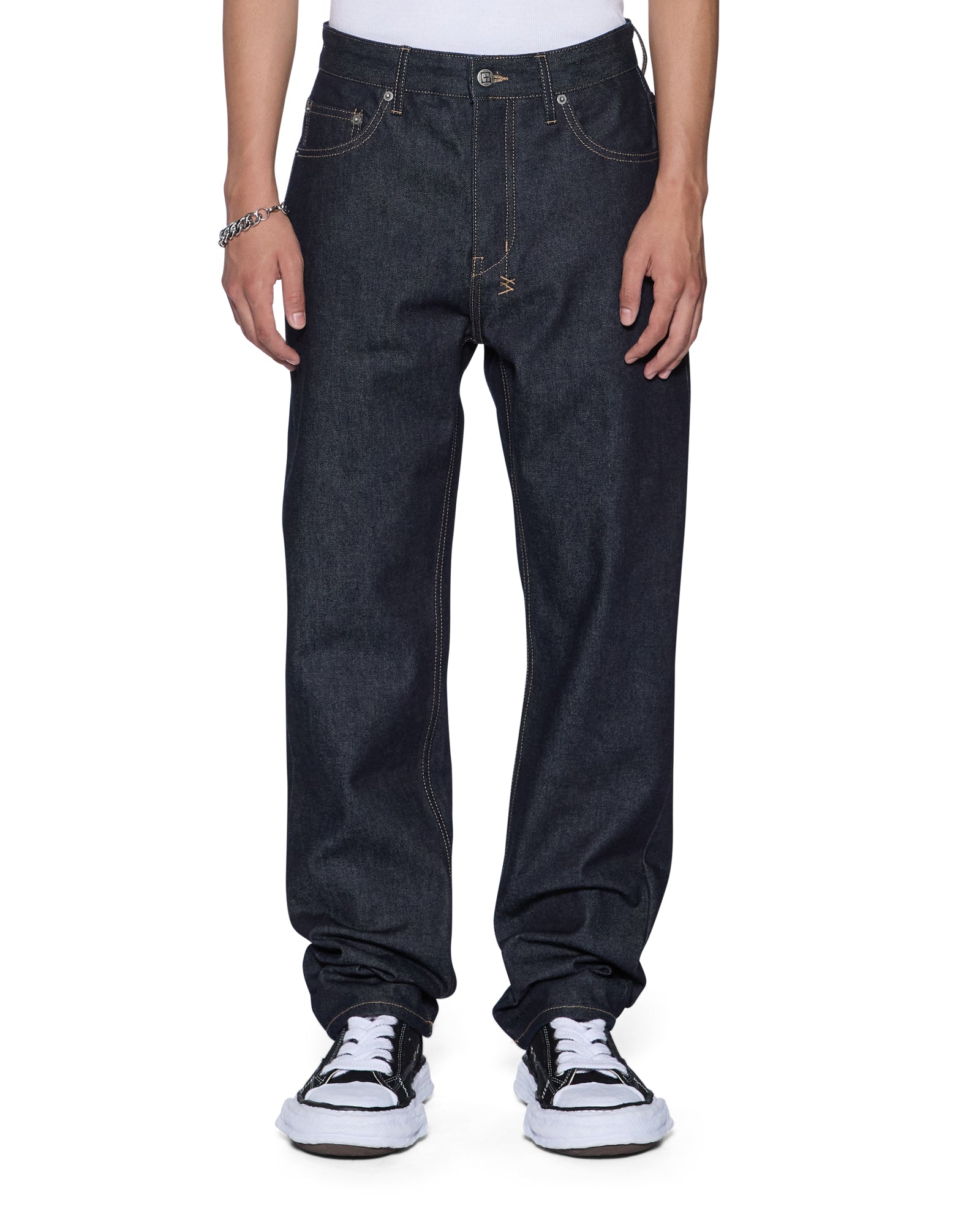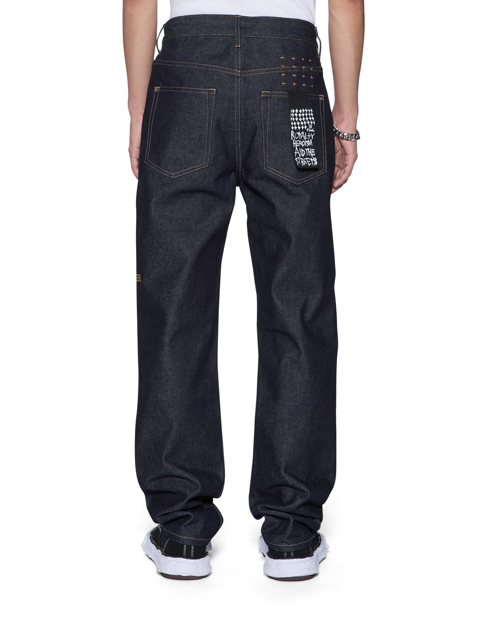 The Hazlow Raw is a mid-rise relaxed straight-leg jean with a regular leg opening, made from 100% cotton in a dark indigo blue wash. It is finished with Ksubi signature t-box and 4x4 embroidery, a custom selvedge pocket tag, and Ksubi branded hardware.