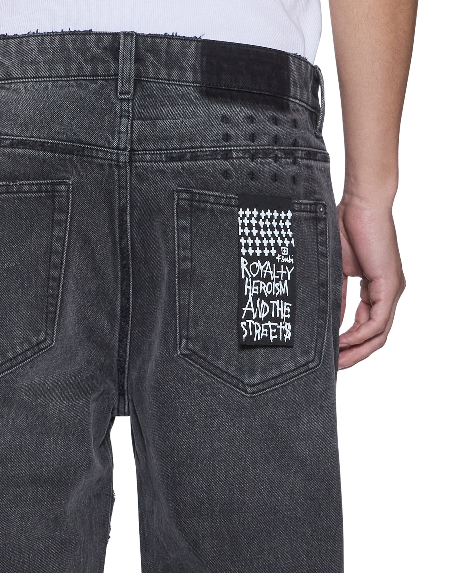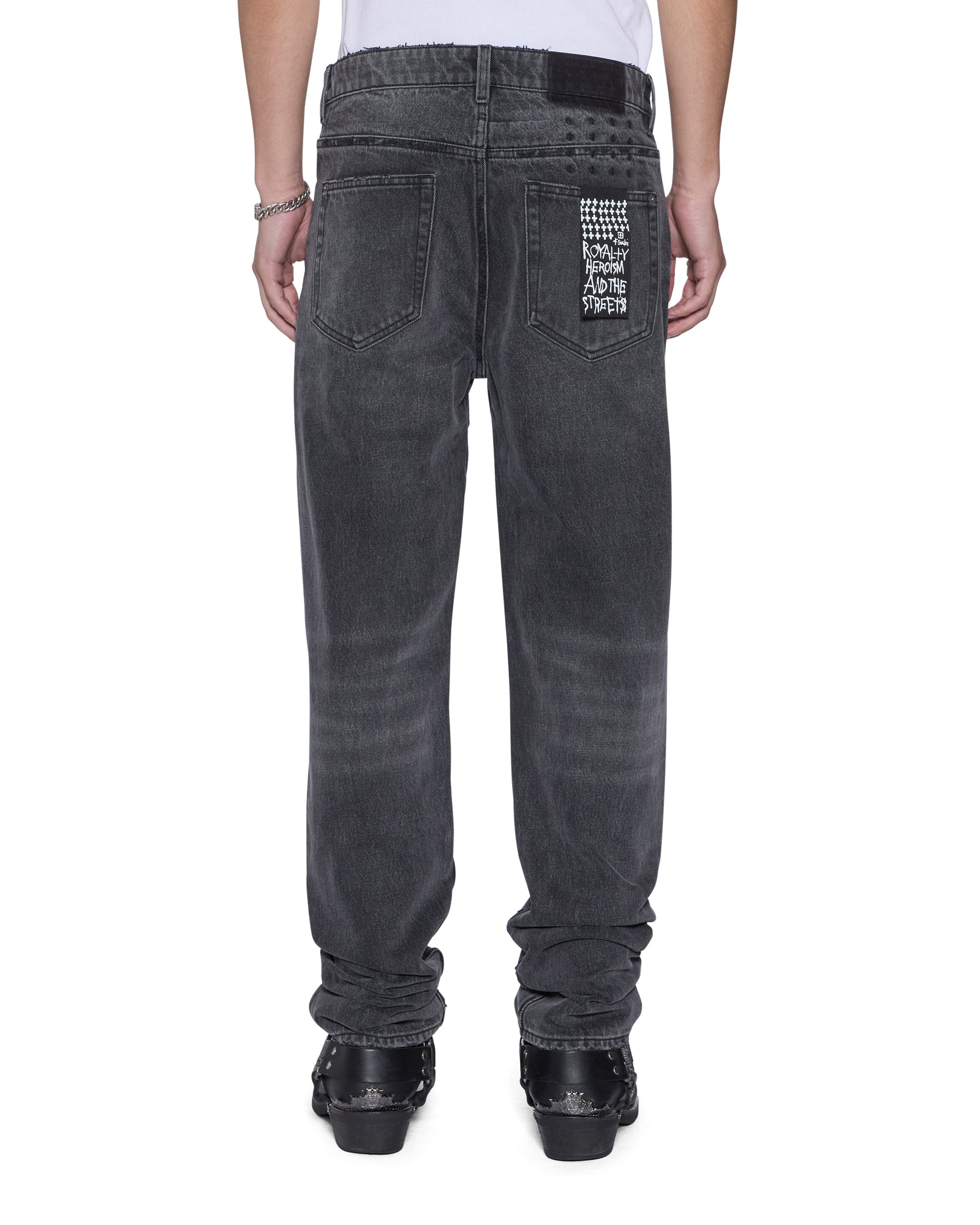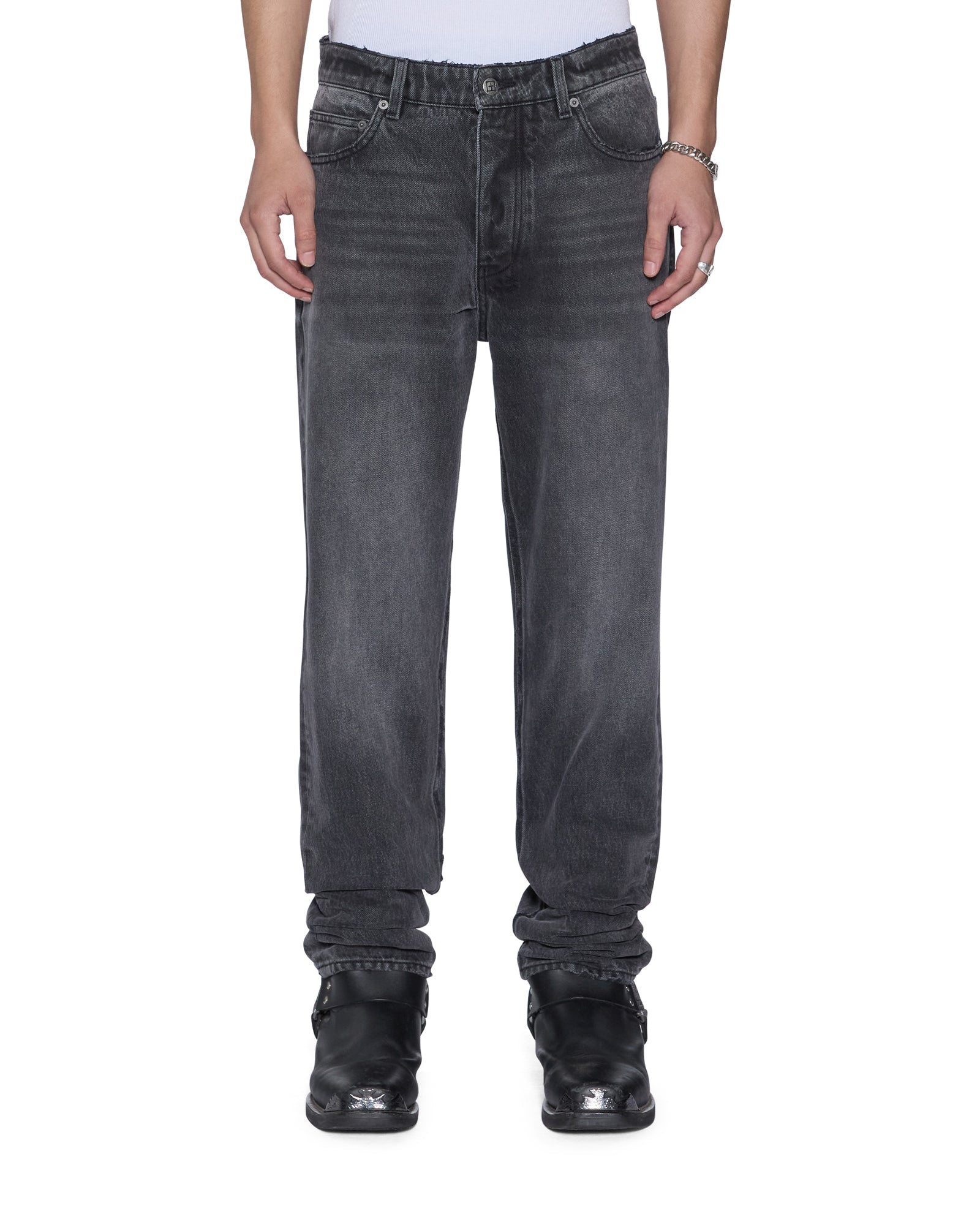 The Hazlow Villian Grey is a mid rise relaxed straight leg jean with a regular leg opening. Made from premium rigid black denim with a vintage wash, it features ghost patching details, signature t-box and 4x4 embroidery and Ksubi branded hardware.