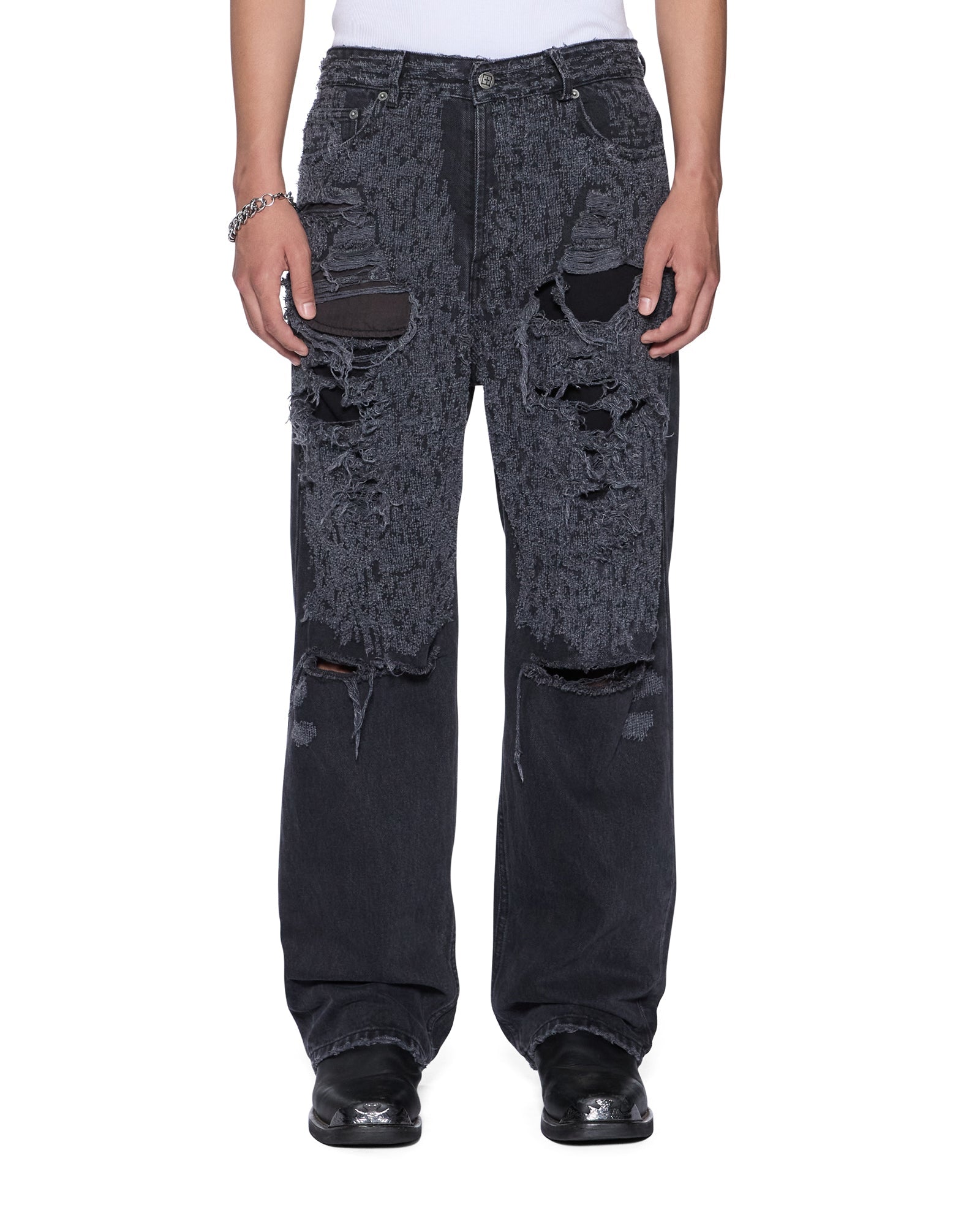 The Maxx Asher Black Trashed is an exaggerated straight-leg jean with a long rise. Made from rigid black denim with a faded stone wash, it is heavily deconstructed with multiple levels of abrasions from the waistband down to the knee, finishing with blown-out knee areas. Finished with signature t-box and 4x4 embroidery and Ksubi branded hardware.