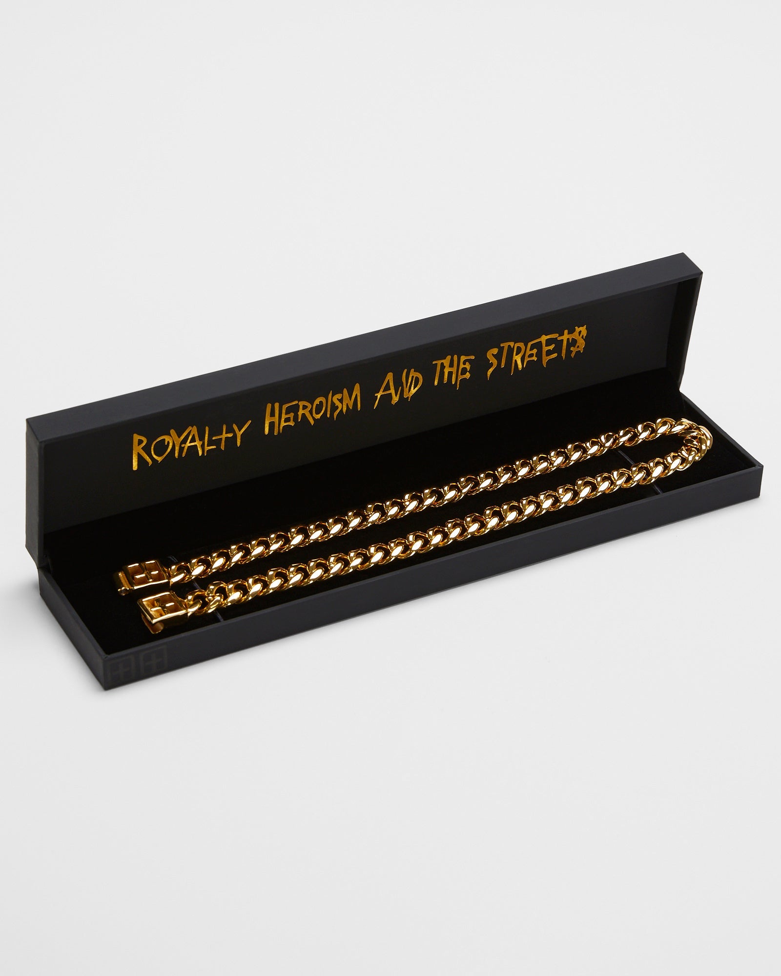 The 18K Dripps Mogul Necklace features Ksubi's iconic box crosses on a chunky chain, with a hidden magnet and lock to secure the closure. This piece has been produced using hypoallergenic natural materials and is made from 925 Silver plated with 18K Gold.