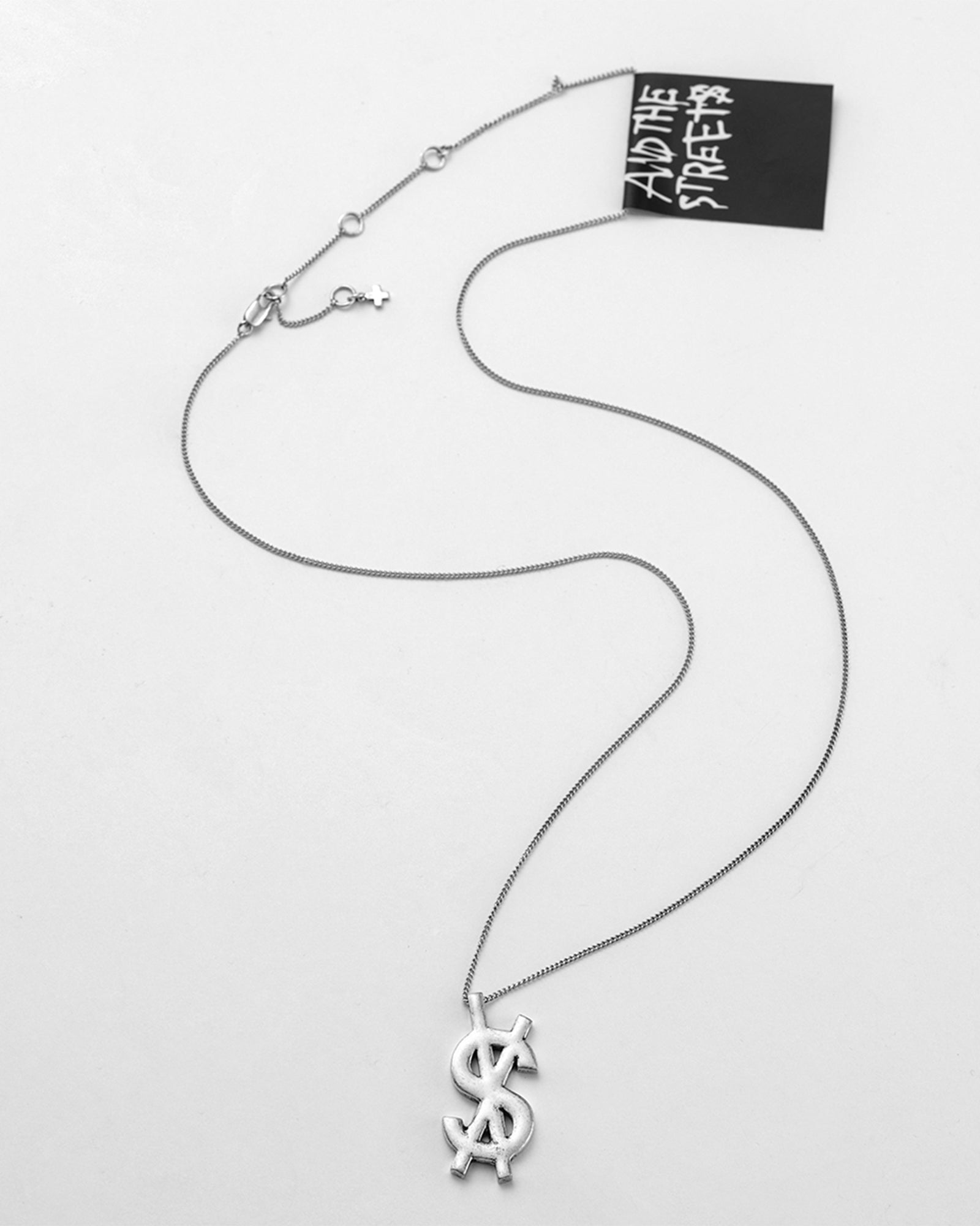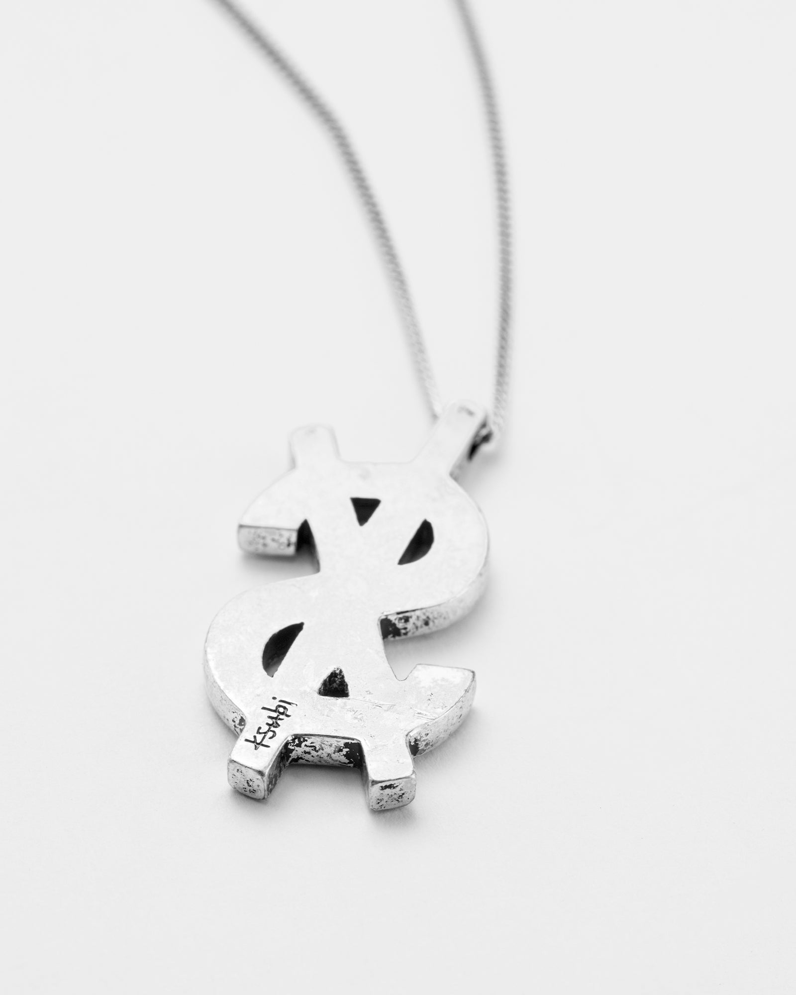 The 925 Dripps Cross Dollar Necklace is made from 925 silver with an antique brass finish, and crafted from hypoallergenic and nickel-free materials. This necklace features the signature Ksubi cross dollar logo on an adjustable chain, and features small cross logo charm at the clasp closure.