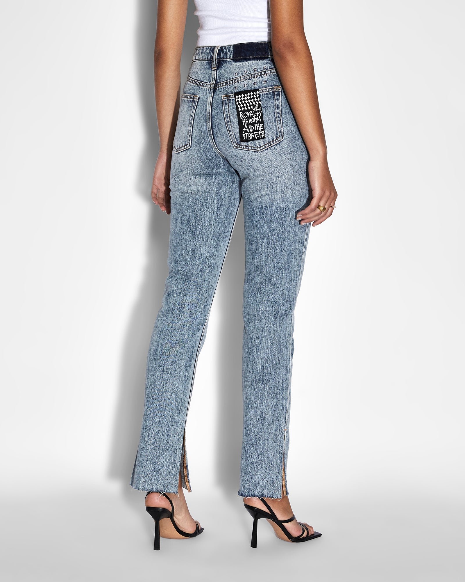 The Melrose Haven Splits is a high rise, slim cigarette fit pant detailed with hem side seam splits and Ksubi branding. Made from premium European rigid denim in washed mid blue indigo colourway with subtle contrast wear, this pant is a full length style with classic five pocket detailing and a raw-cut hem.