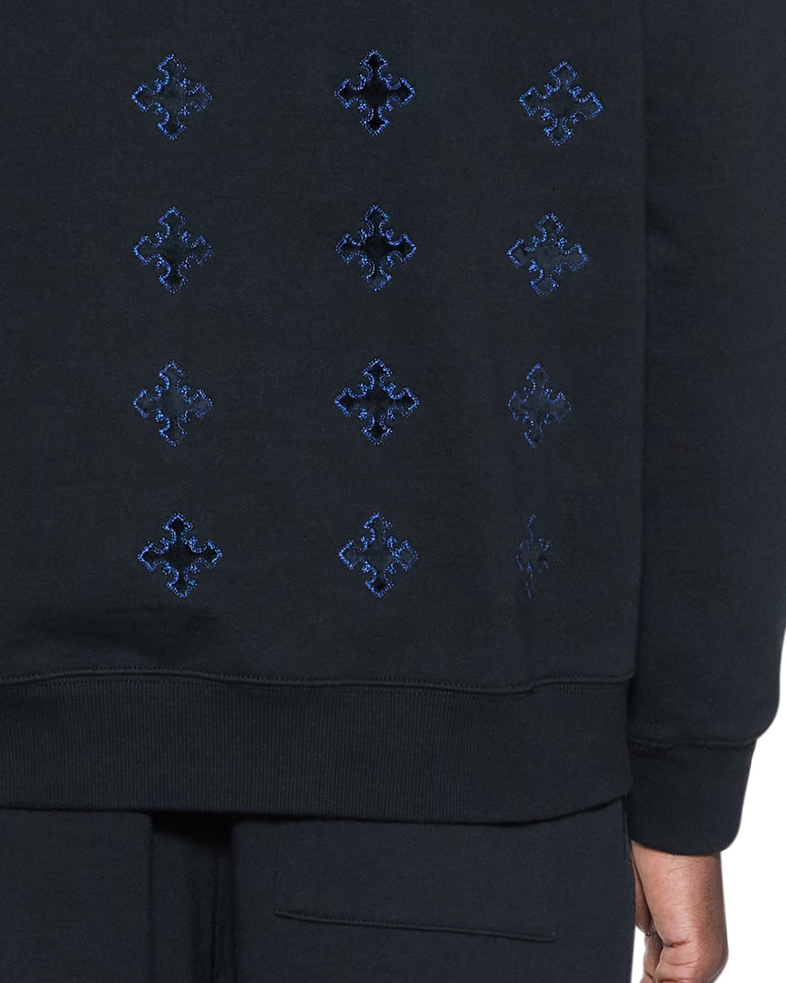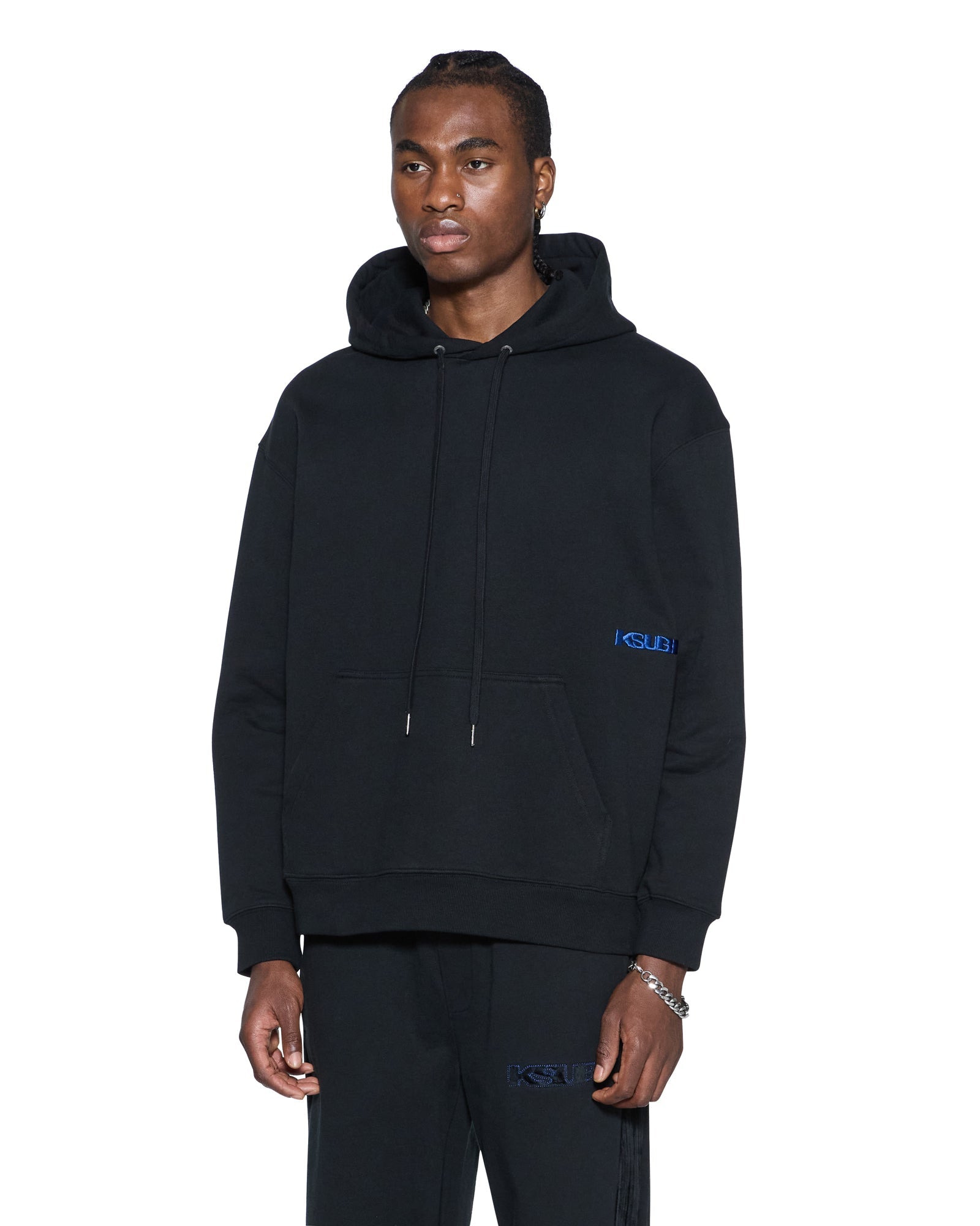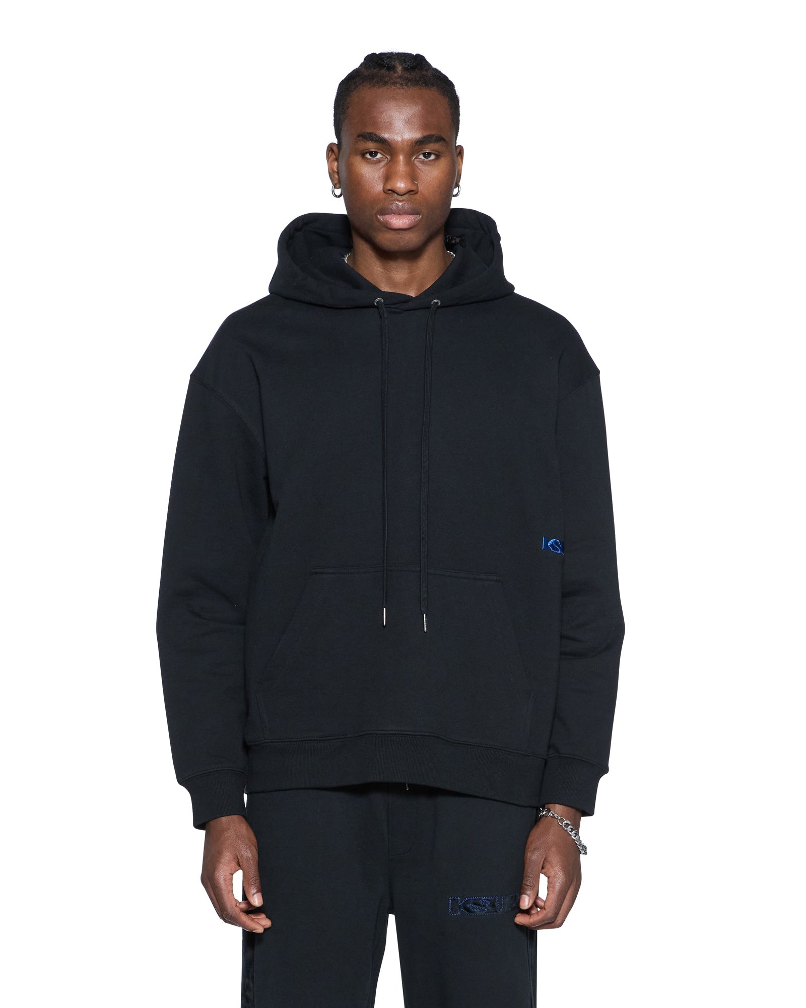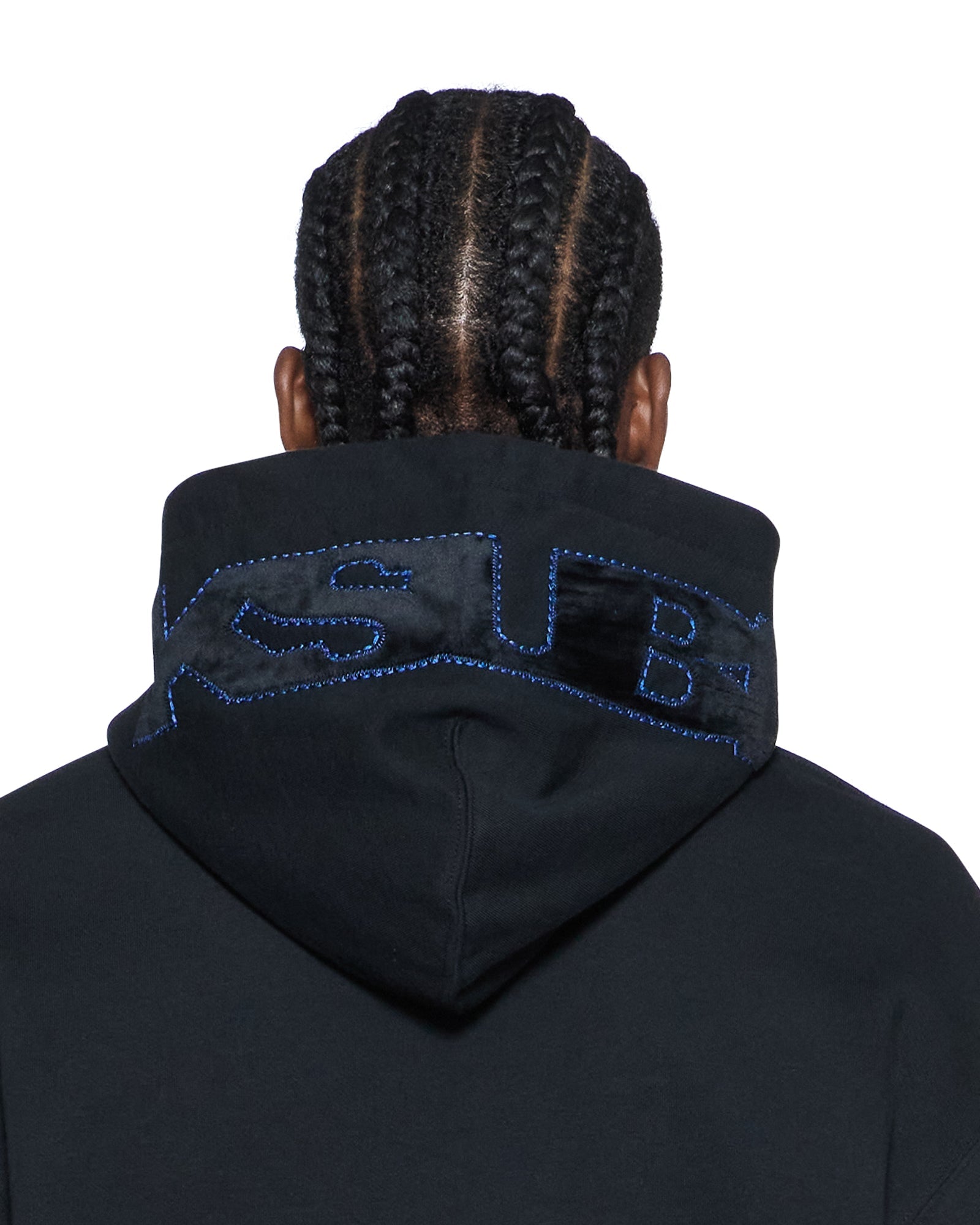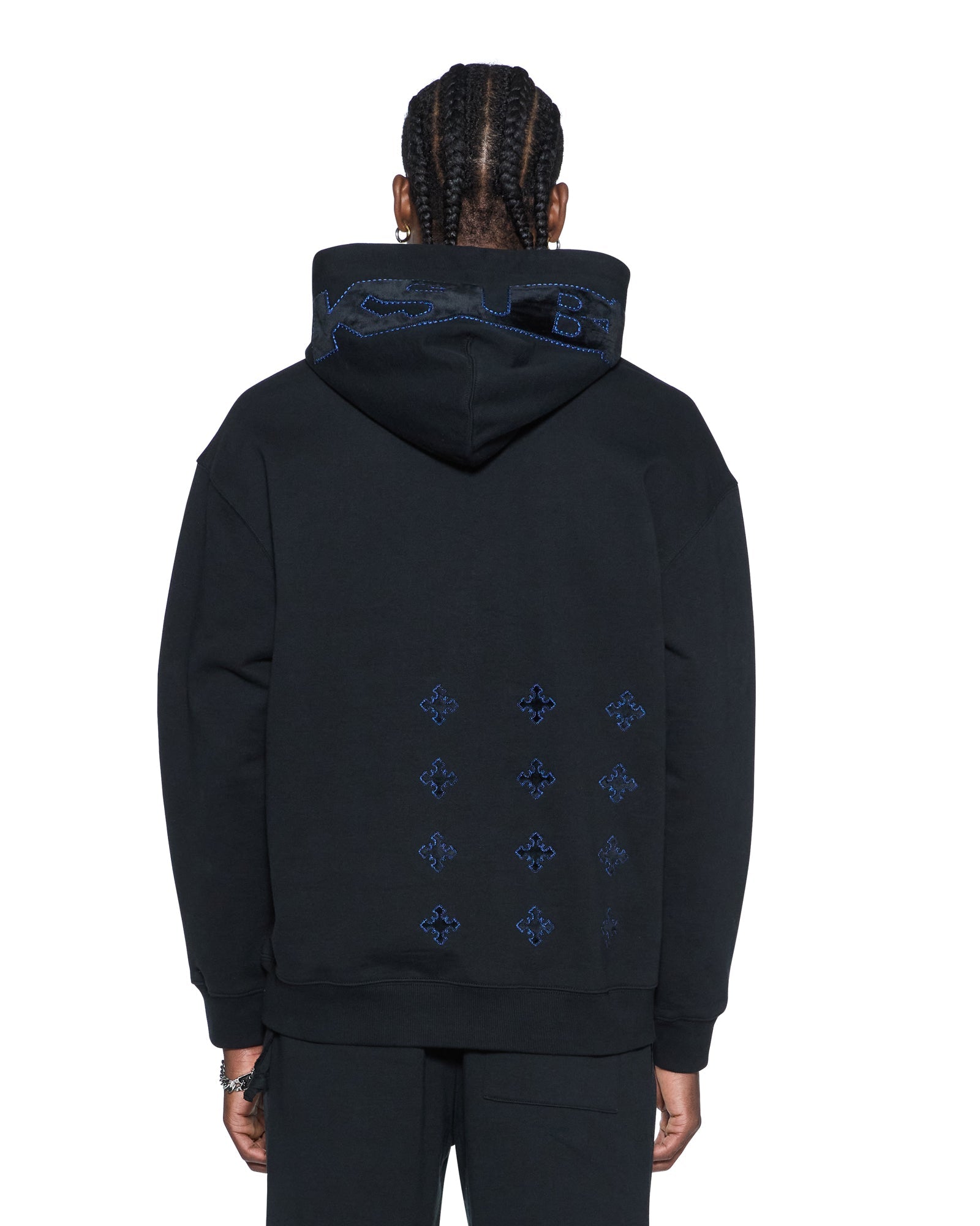 The 4X4 Revamp Biggie Hoodie Black is an oversized fit hoodie with drawstrings, metal hardware, and signature rats tail. Crafted from premium loopback fleece in jet black, it features a tonal flocked applique Sign of the Times artwork on the hood with cobalt blue saddle stitching, front embroidery, and is finished with signature T-box and flocked-applique 4x4 branding.