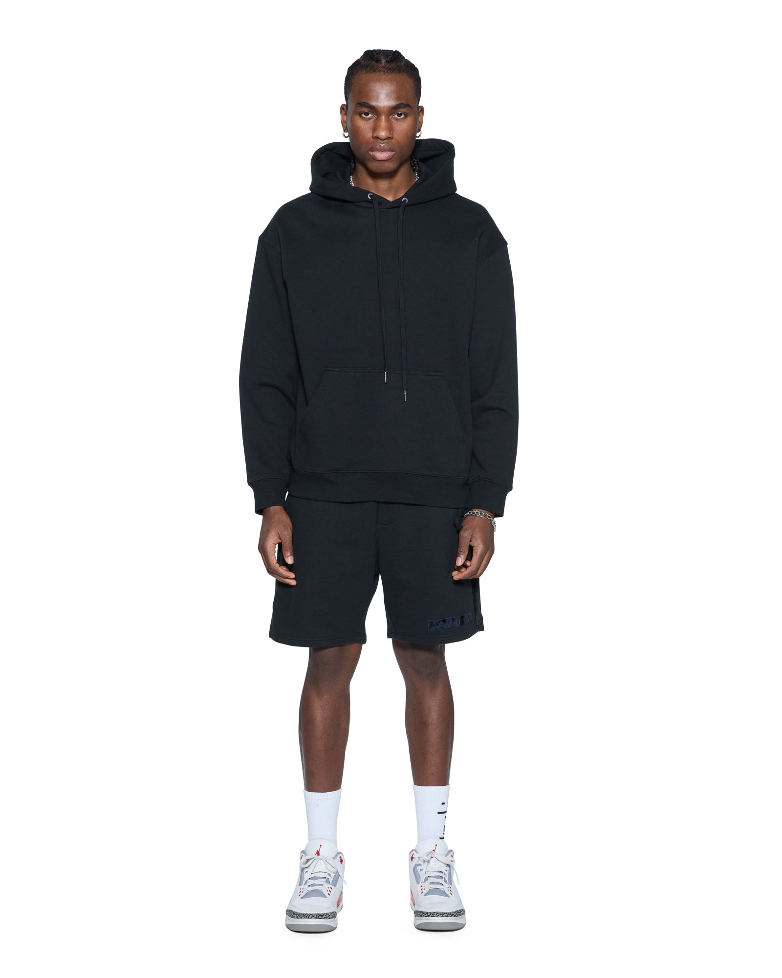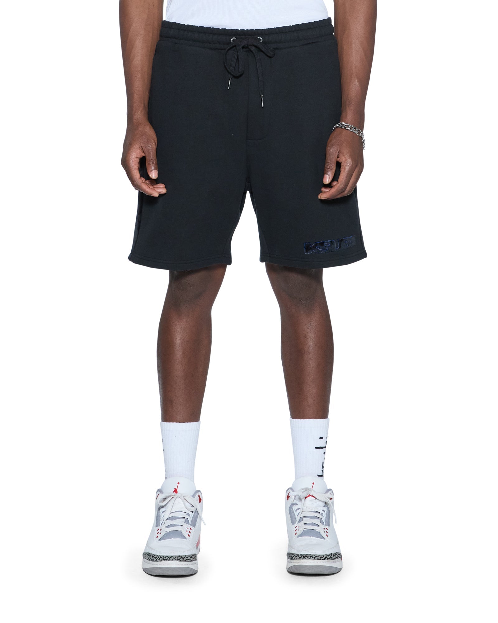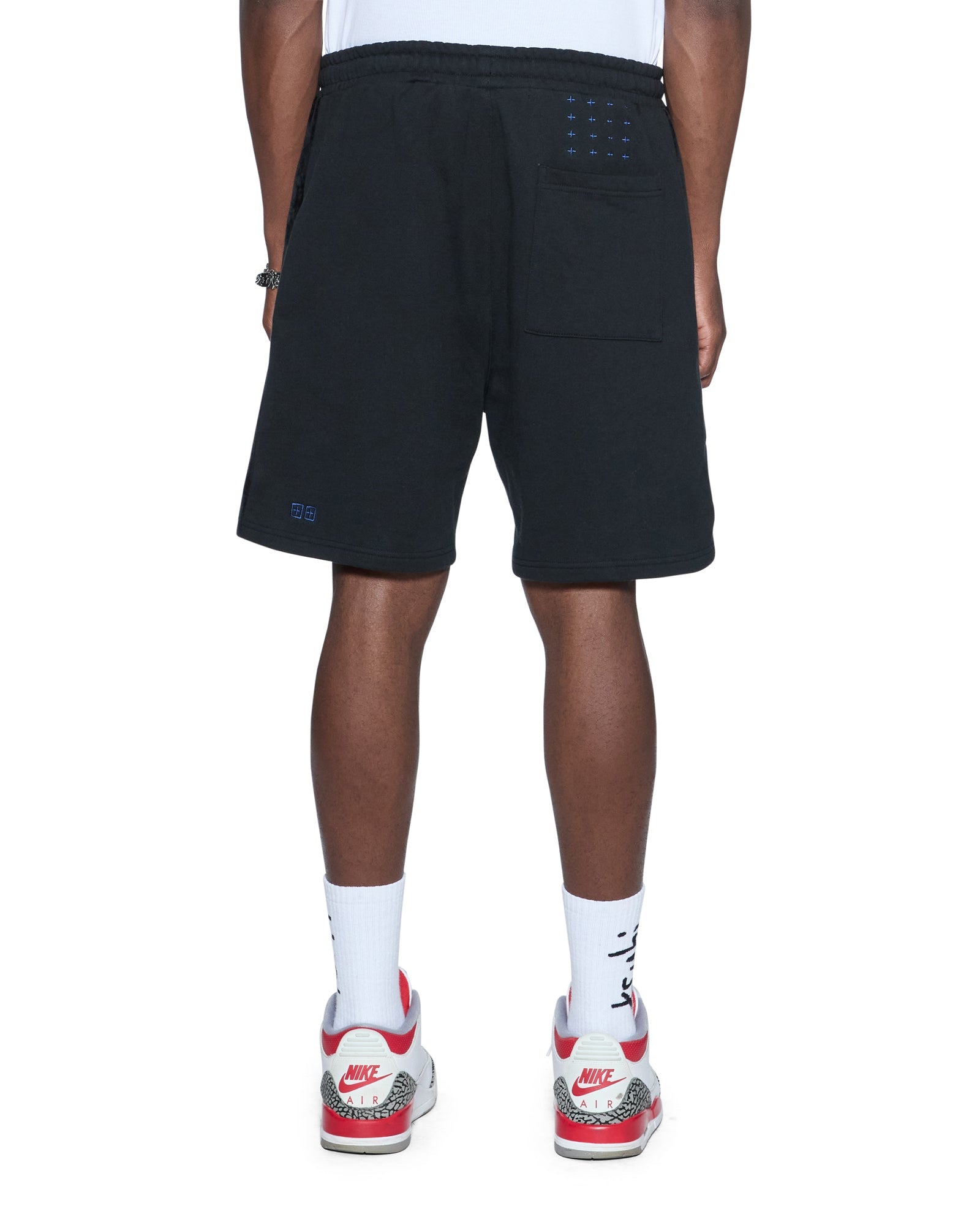 The 4X4 Luxe Synthesis Trak Short Black is a relaxed fit short finishing at knee length, with in-seam pockets and back patch pockets. Cut from heavyweight loopback cotton fleece in jet black, it features flocked side seam panels with cobalt blue saddle stitching, a Sign of the Times applique logo, and is finished with signature T-box and 4x4 embroidery branding.