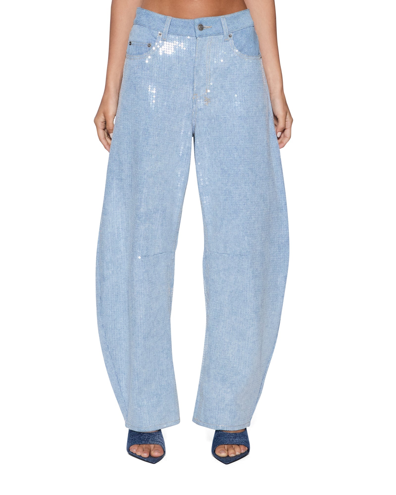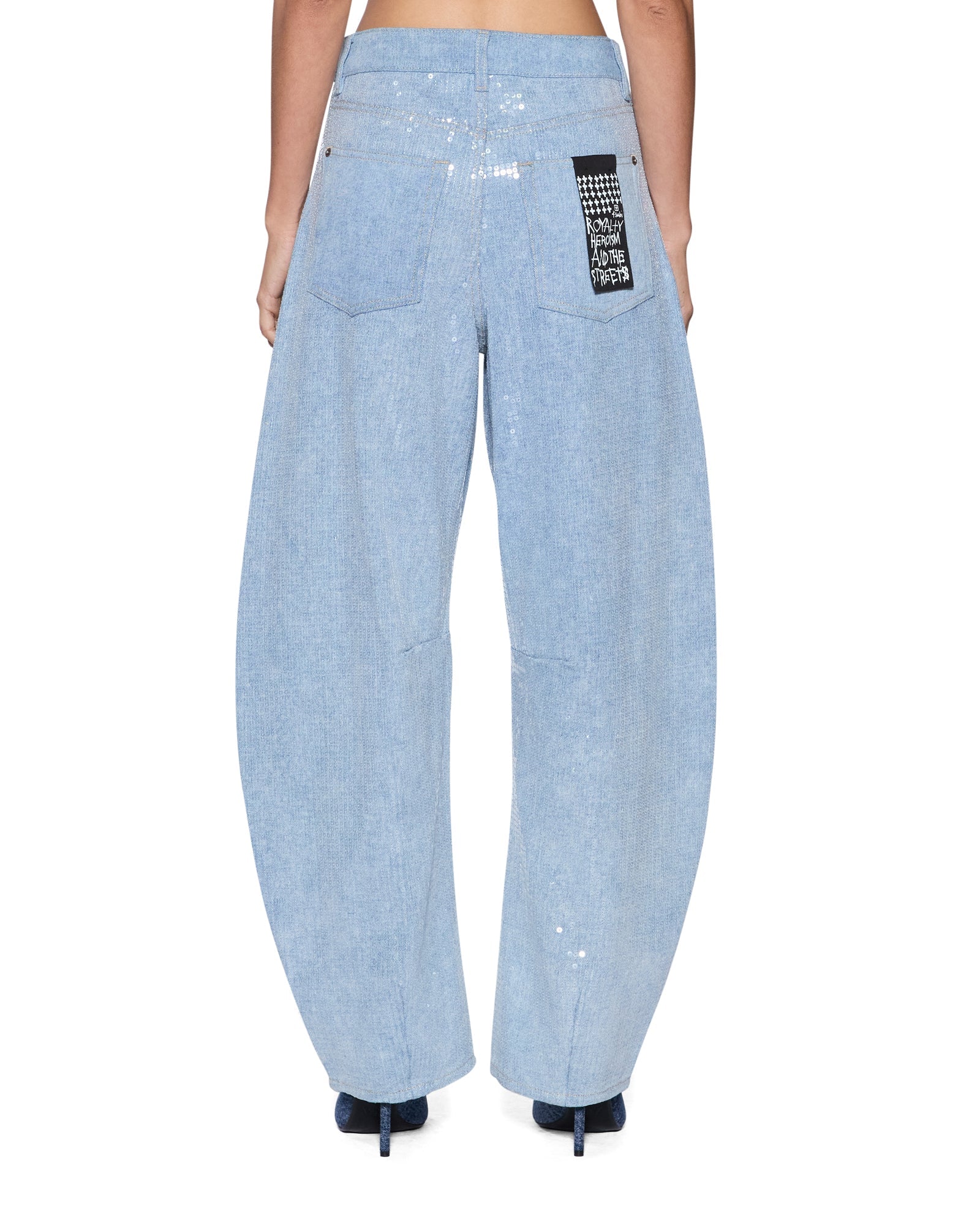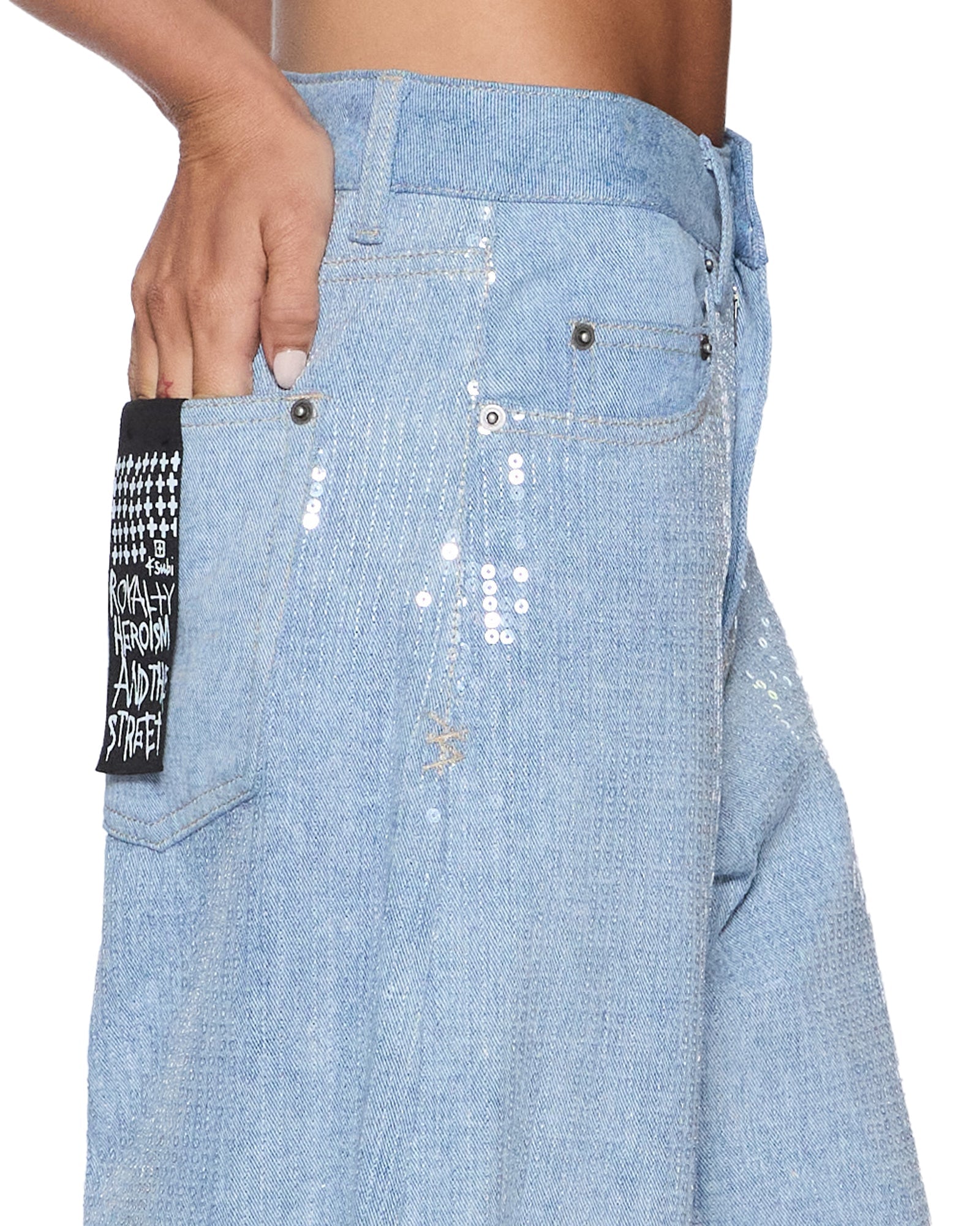 The Barrel Jean Sequin Spirit Spark is a mid rise, relaxed fit jean with a distinctive barrel shaped leg that tapers at the ankle. Made from lightweight denim in a light blue wash, it is finished with all over clear sequin embellishment for an elevated party look. Finished with classic five pocket styling, anti silver Ksubi branded hardware, t-box and 3x4 embroidery and a removable pocket tag at the back.
