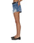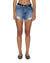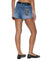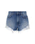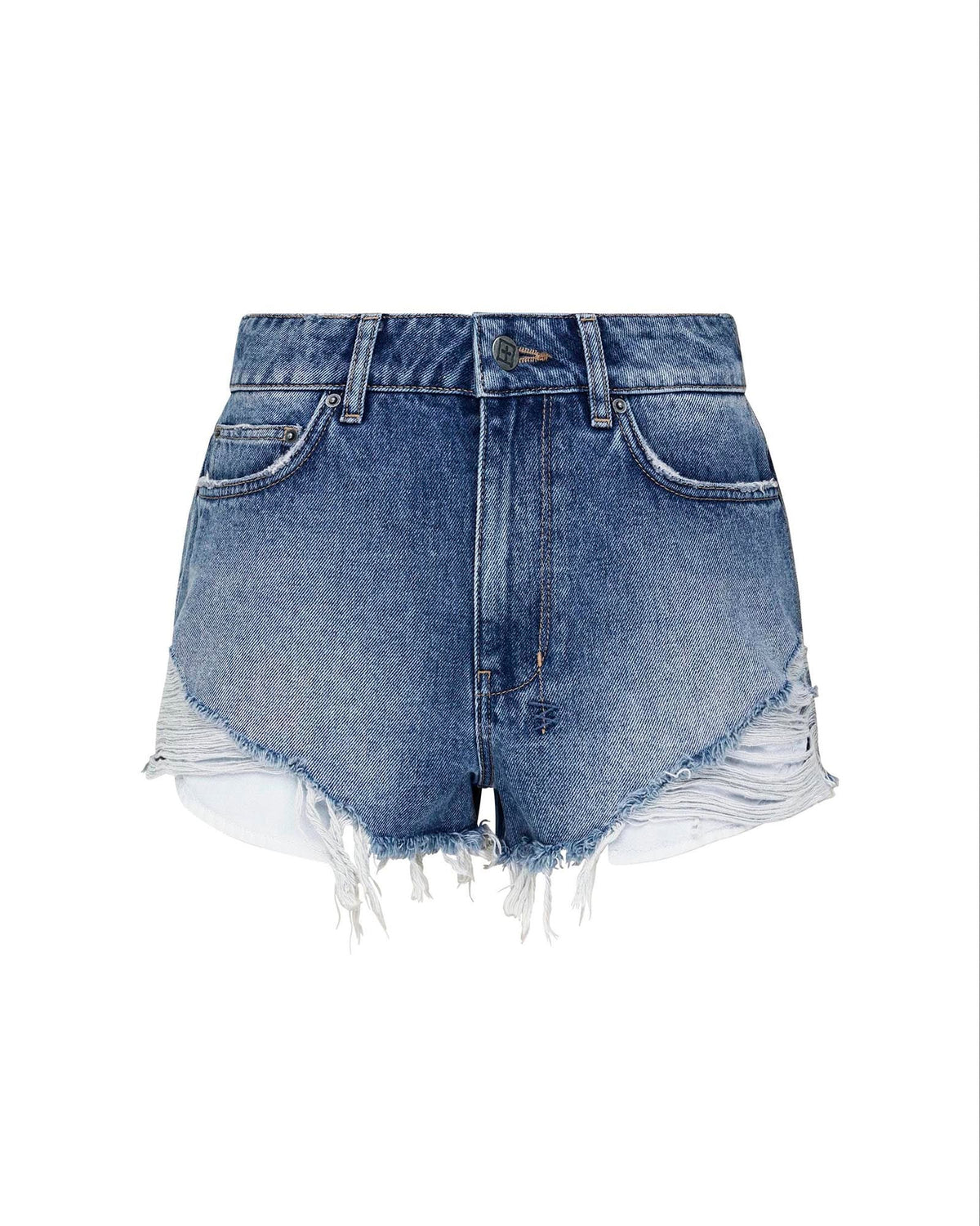 The Kali Shorts Exposed Tidal is a mid-rise high thigh length short with raw cut hem. Made from a premium European rigid denim in a mid-blue wash with vintage highlights and signs of wear with subtle grinding at the waistband, pockets, and hem. Featuring exposed pocket bags, decon hit at right hip, classic five-pocket styling, with worn white Ksubi branded hardware, T-box and 3x4 embroidery, removable pocket tag attached to wearer's right back pocket.