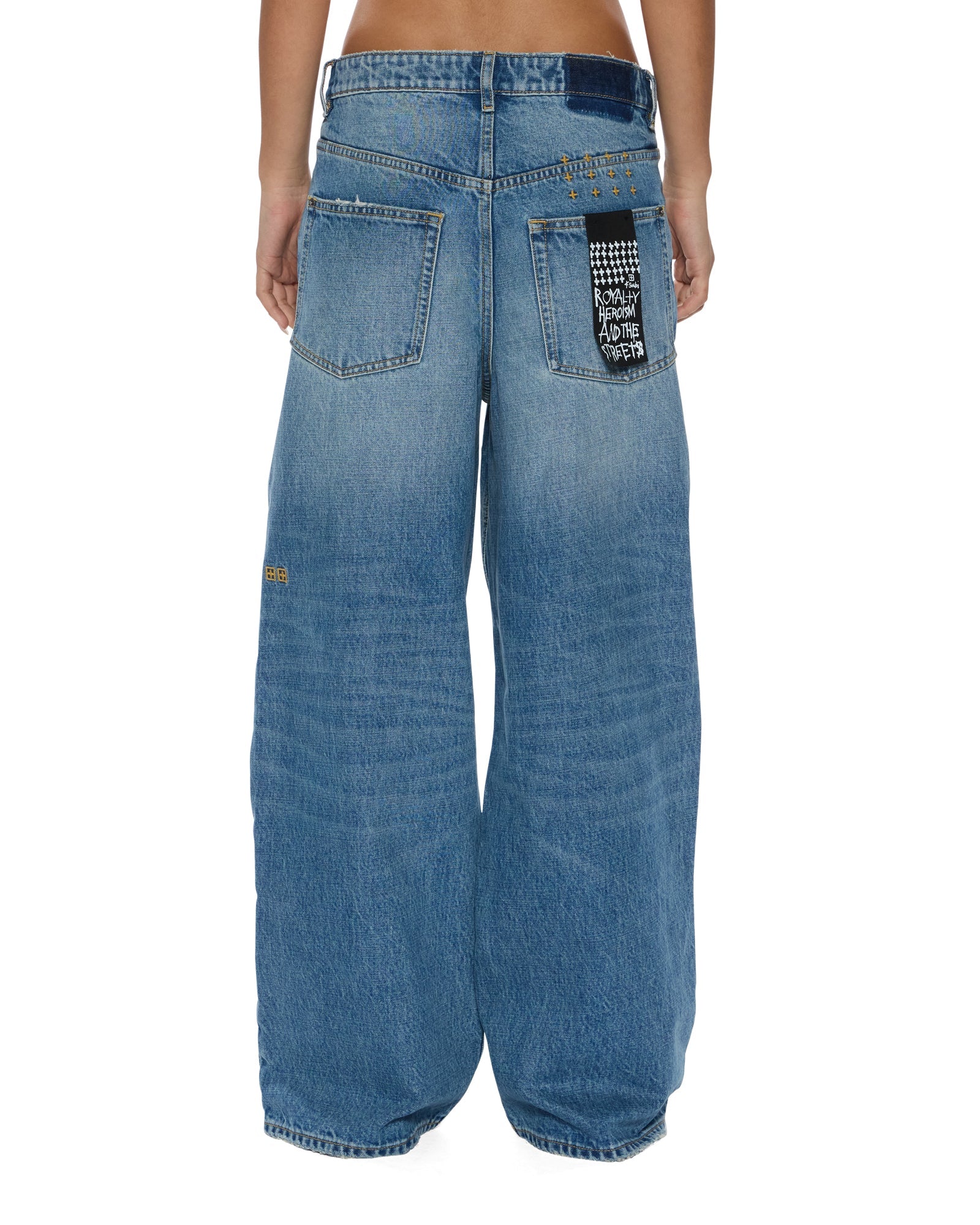 The Ksuper Maverik Jean is Ksubi's baggiest fit yet, featuring an exaggerated oversized silhouette with a super low rise and full length. Made from premium rigid denim with a vintage mid-blue stone wash and tobacco topstitching, it showcases signs of wear along the hem, waistband, and pocket openings. Design details include front leg pin tucks, classic five-pocket styling, and Ksubi branded anti-silver hardware. Finished with T-box and 3x4 embroidery, a removable pocket tag on the wearer's right back pocket, and a pin tuck on the front left pocket, this fit delivers maximum comfort with a bold street-style edge.