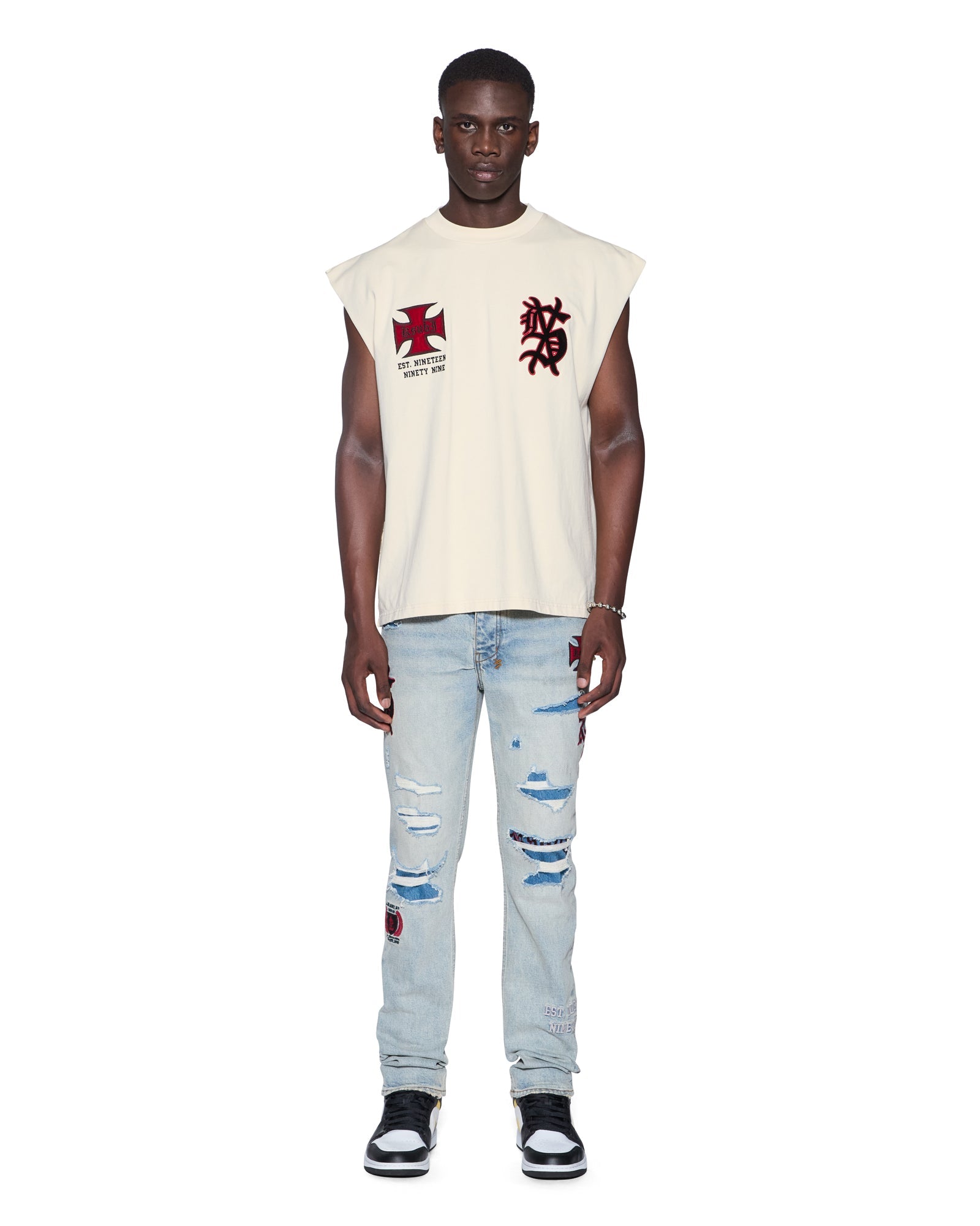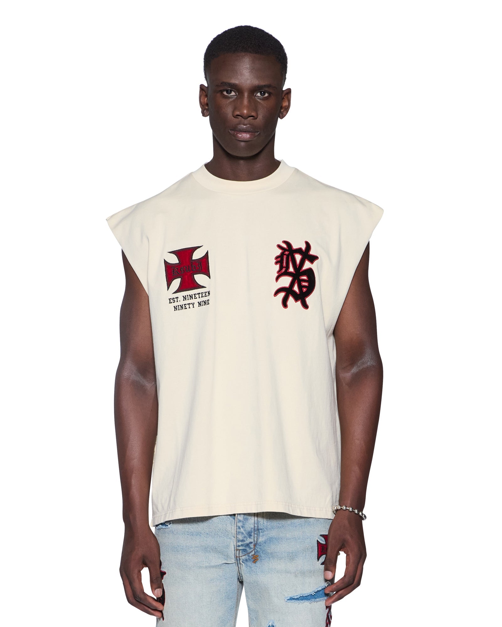 The League Ekcess Cut Off Desert is an oversized fit sleeveless t-shirt with a raw cut back hem, reverse overlocked side seam and signature rats tail. Made from premium cotton jersey in a garment dyed desert colourway, it features seasonal and core artworks embroidered and patched on the front and back. Finished with signature t-box and 4x4 branding.