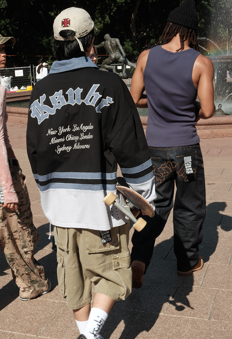The Low Rider Mini Skirt Boneyard Black is a low-rise mini skirt with classic five-pocket styling, crafted from premium European denim in a faded black wash. It features front carpenter pockets with rivet detailing, a raw cut hem, anti-silver branded hardware, and embroidered 3x4 and T-box, designed to sit lower on the hips.