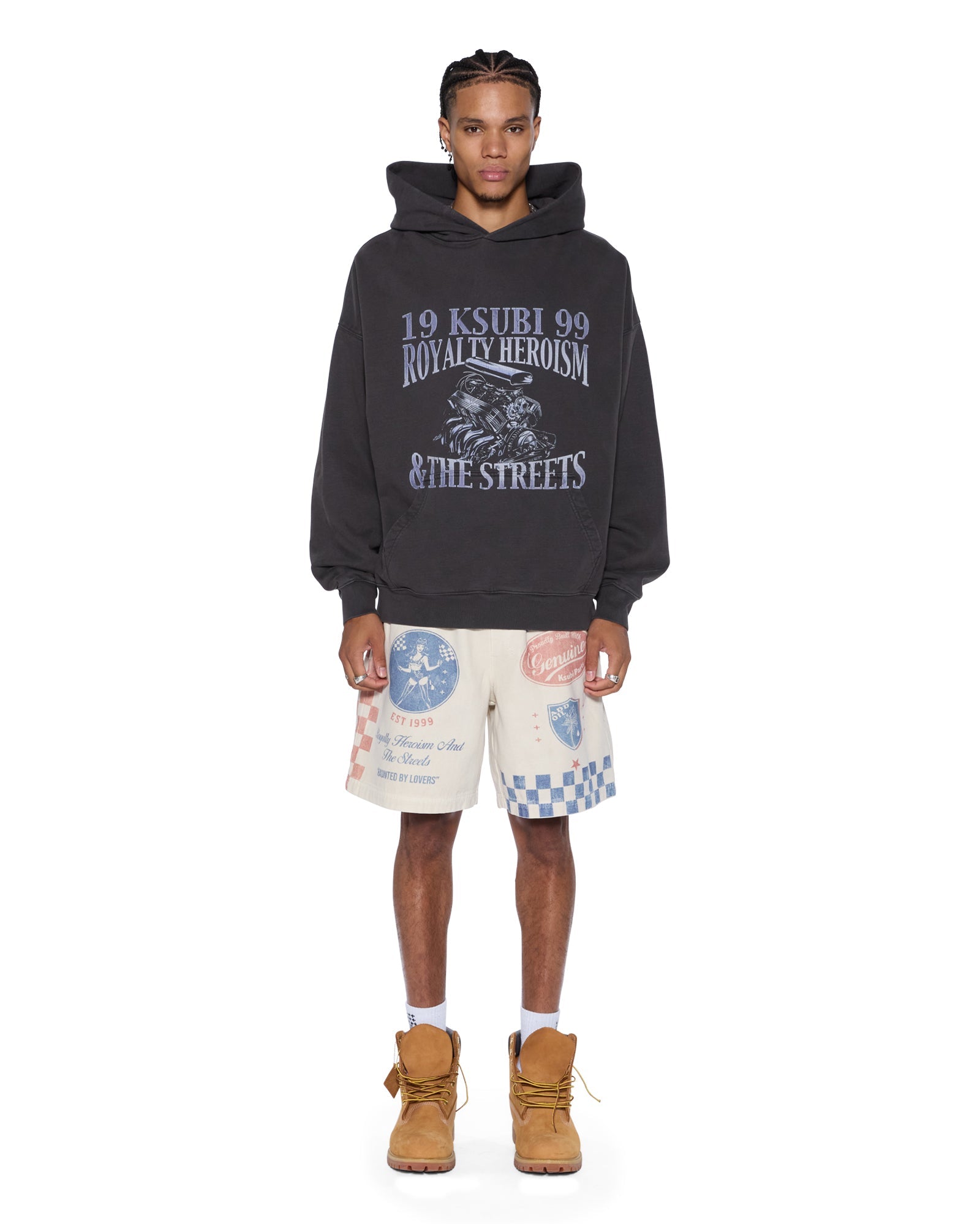 The Pit Lane Life Short Printed is a regular fit elastic waist short with a drawstring front, cutaway pockets, and a single back patch pocket. Cut from an overdyed nailhead canvas in a tan colour with a stone wash, it features seasonal artwork printed on the front and back, finished with signature T-box and 4x4 embroidery branding and Ksubi branded hardware.