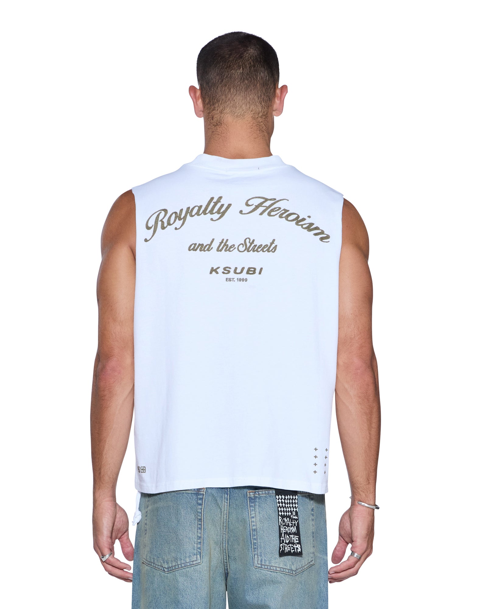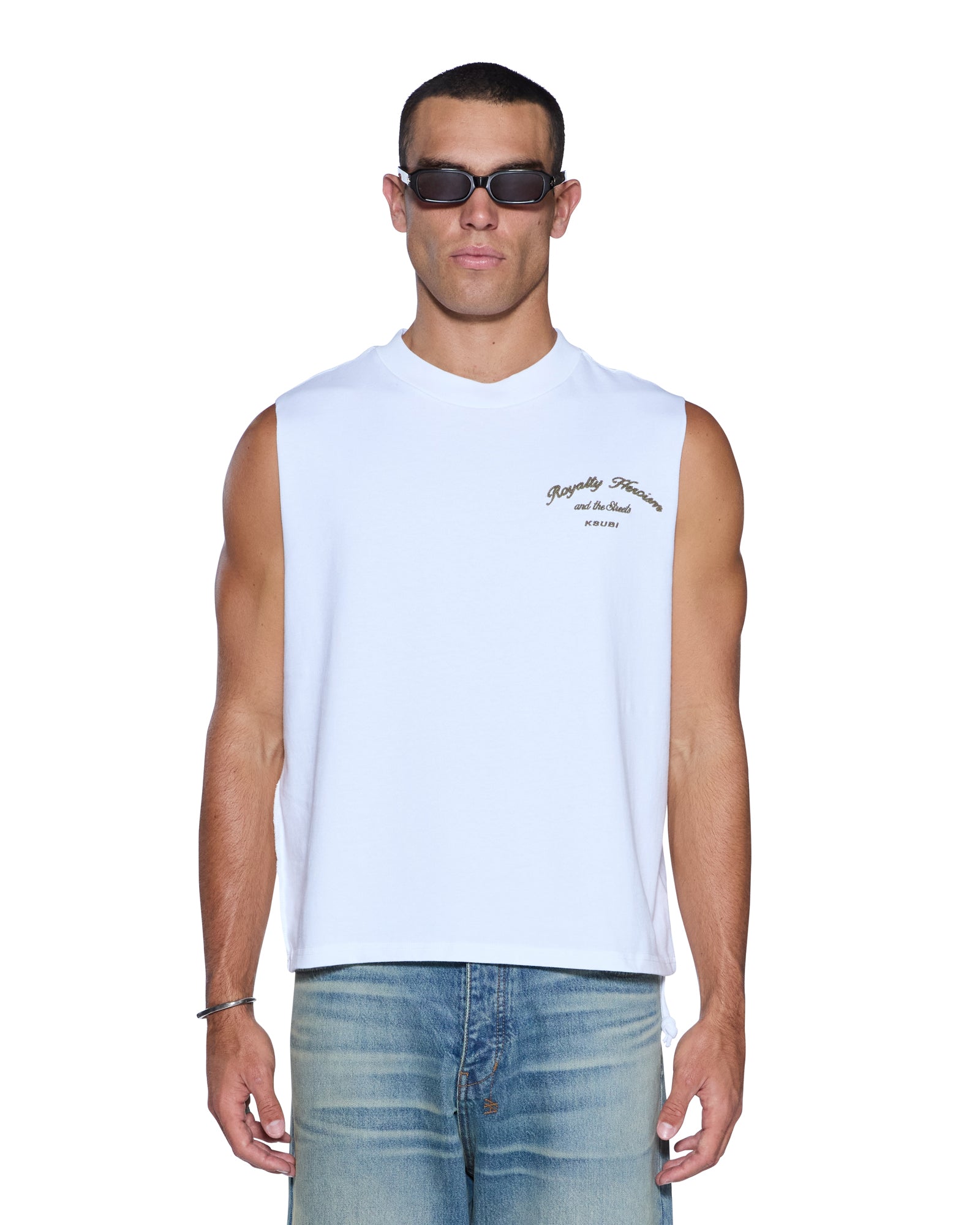 The Royalty Halen Cut Off Tru White is a boxy, oversized sleeveless tee with a waist-finishing length, exaggerated shoulder drop, reverse overlocked side seam and signature rats tail. Crafted from heavyweight cotton jersey, it features seasonal chainstitch embroidered artwork at the front and back, and is finished with signature T-box and 4x4 branding.
