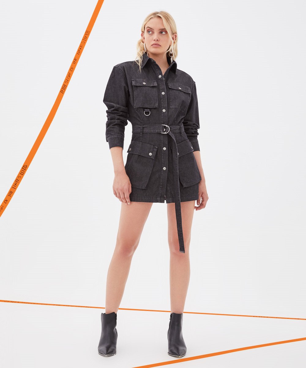 The Shelter Dress is a button through denim mini dress with a full length sleeve. This design features darting throughout for more shape, D-ring waist belt, utility detailing with several front patch pockets, branded hardware, snap button front, long sleeves, constructed in a premium cotton fabrication and comes in a washed black colourway.