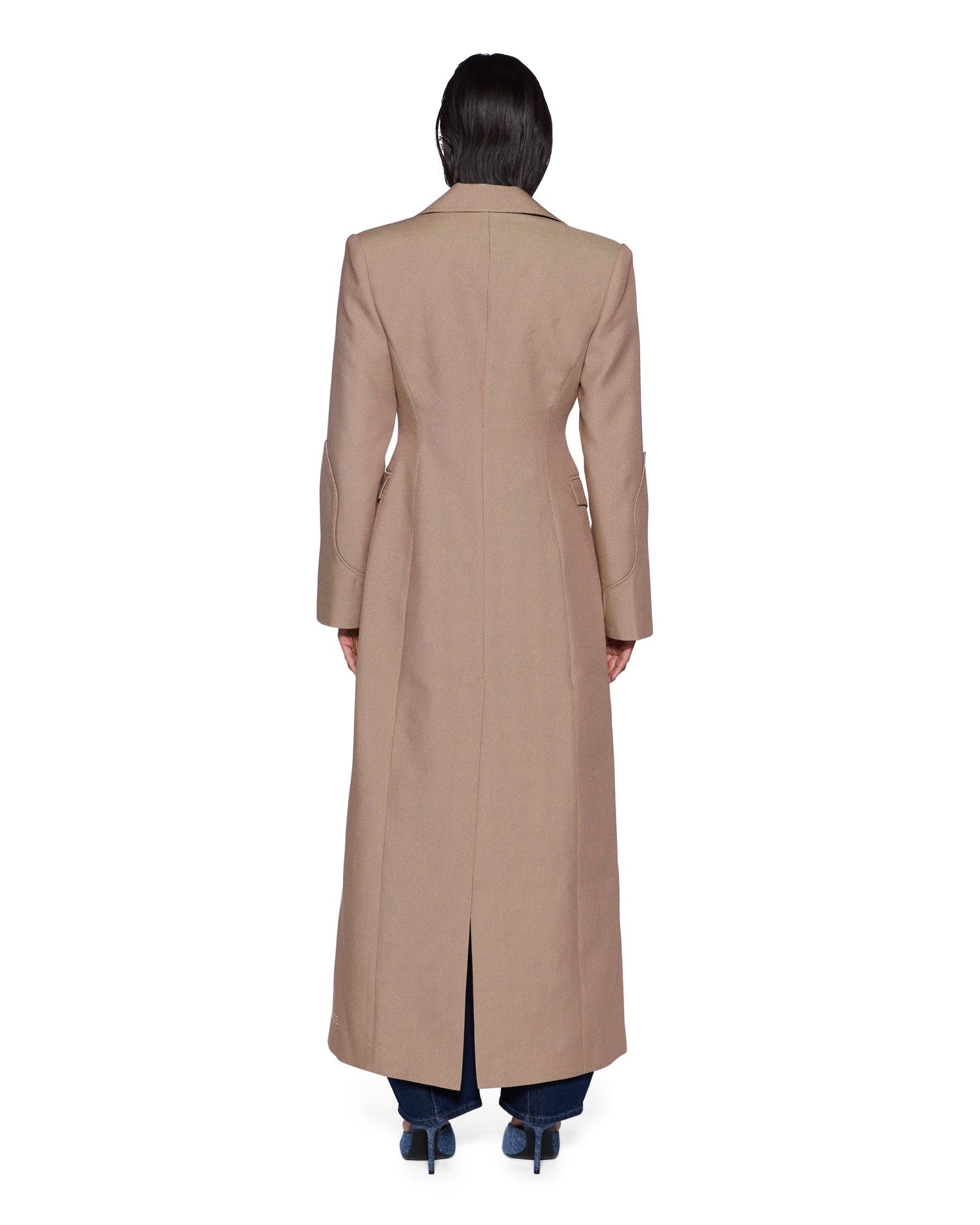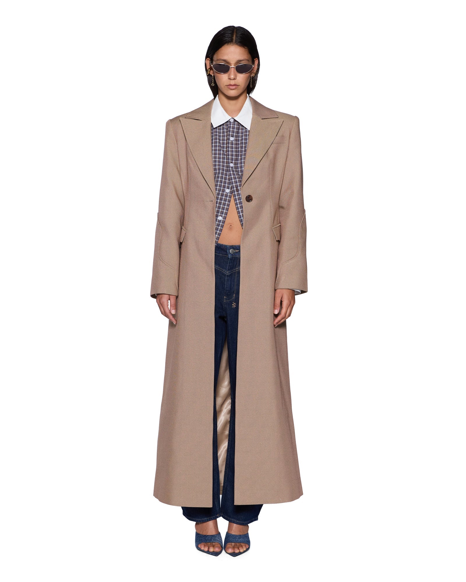 The Stance Tailored Coat Tan is a cinched-waist, longline coat with exaggerated strong shoulders and a fully lined construction. Crafted from multi-toned tan canvas weave, the coat is designed with an oversized collar, notched lapels, and a single-breasted button closure. The style features western panelling along the sleeves with tonal piping, angled western-style pocket flaps, a 1999 stud at the back neck, and is finished with signature T-box embroidery as an elevated layering piece to style over any Ksubi denim look.