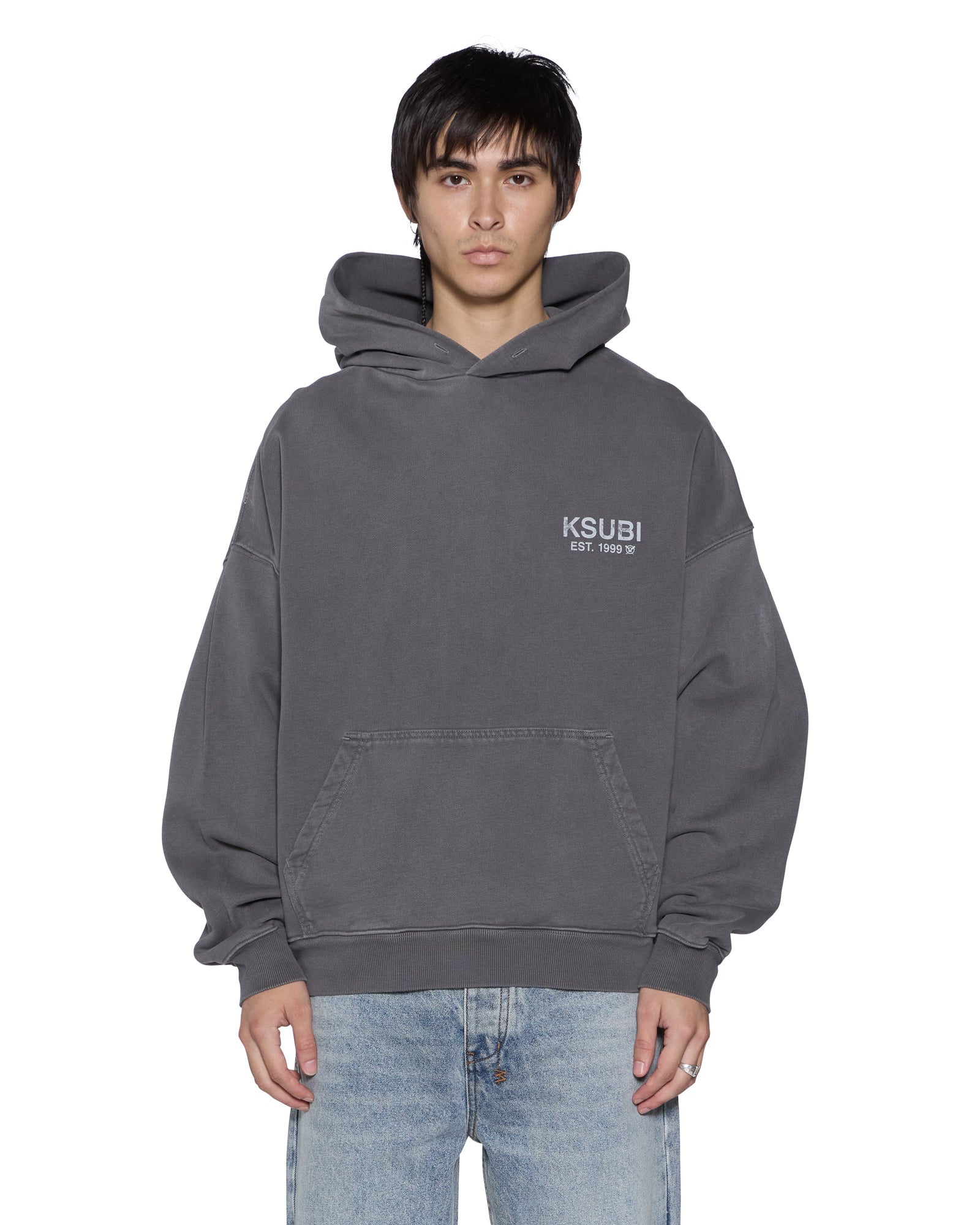 The State Ekcess Hoodie Black Fade is a boxy, oversized fit hoodie with a single-piece hood, front pouch pocket, and signature rats tail detail. Made from premium loopback fleece in a garment-dyed teal blue with an aged wash, it features State printed artwork on the front and back, finished with T-box and 4x4 embroidery branding.