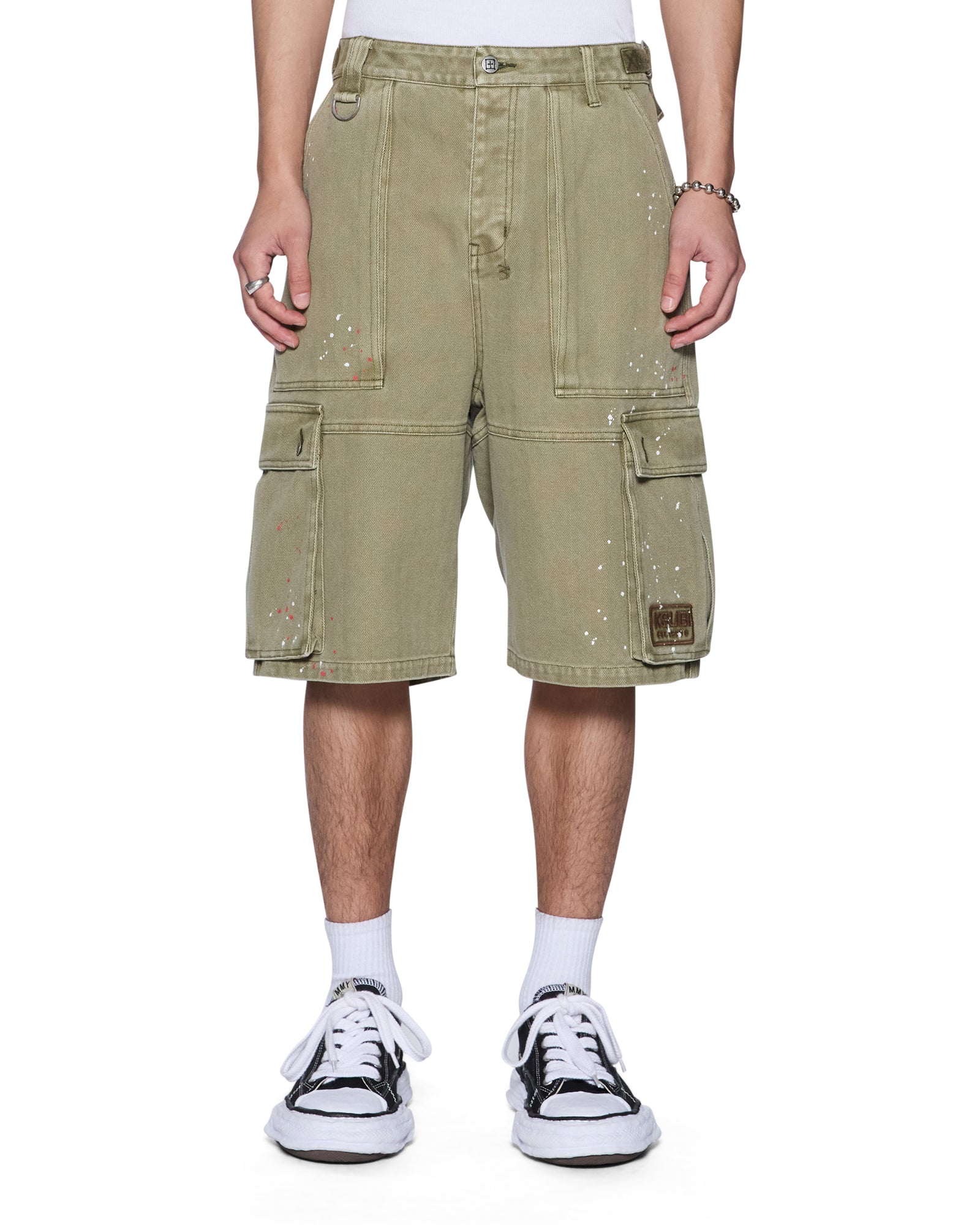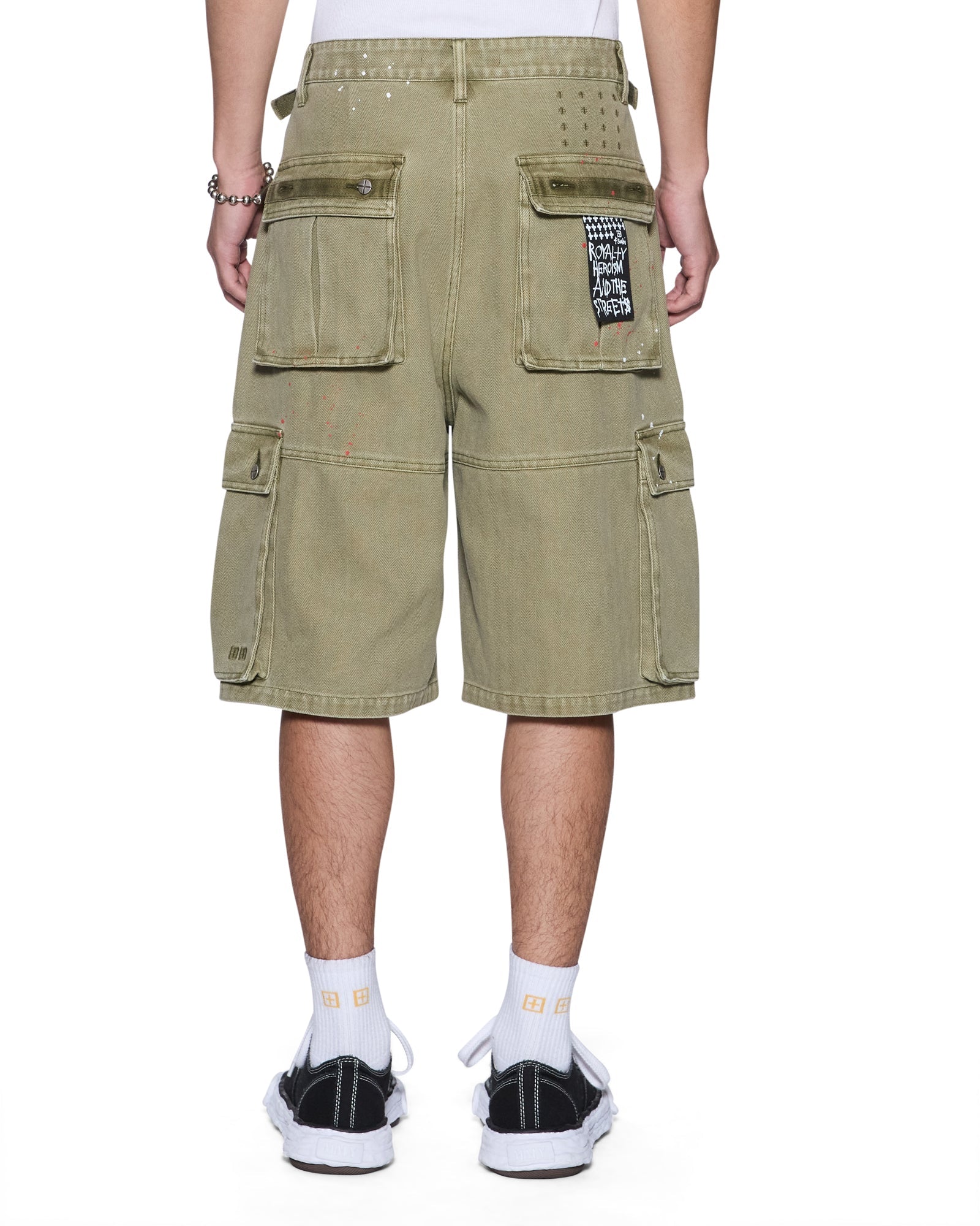 The Trooper Cargo Short Militant is a relaxed leg cargo short featuring side bellowing cargo pockets, regular side-entry pockets and back flap pockets, crafted from cotton herringbone fabric garment dyed militant green with faded wash treatments. Detailed with grosgrain puller tabs at the waist, back pocket, internal waistband and side seam, it features a seasonal Ksubi embroidered patch and paint splatters, finished with signature t-box and 4x4 embroidery and Ksubi branded hardware.