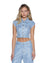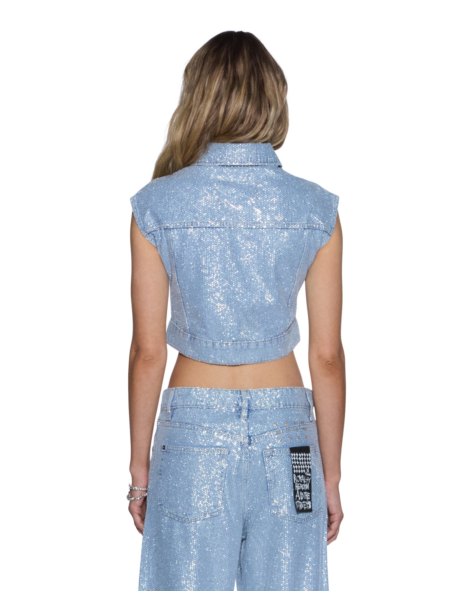 The Trucker Vest High Rollers is a sleeveless, cropped, fitted trucker vest made from premium European rigid denim in a light blue wash with an enzyme-soft finish. Densely embellished with all-over diamante hotfix crystals for a statement look, it features classic trucker panel detailing, front flap pockets, anti-silver Ksubi-branded hardware, and is finished with signature T-box and 3x4 embroidery.