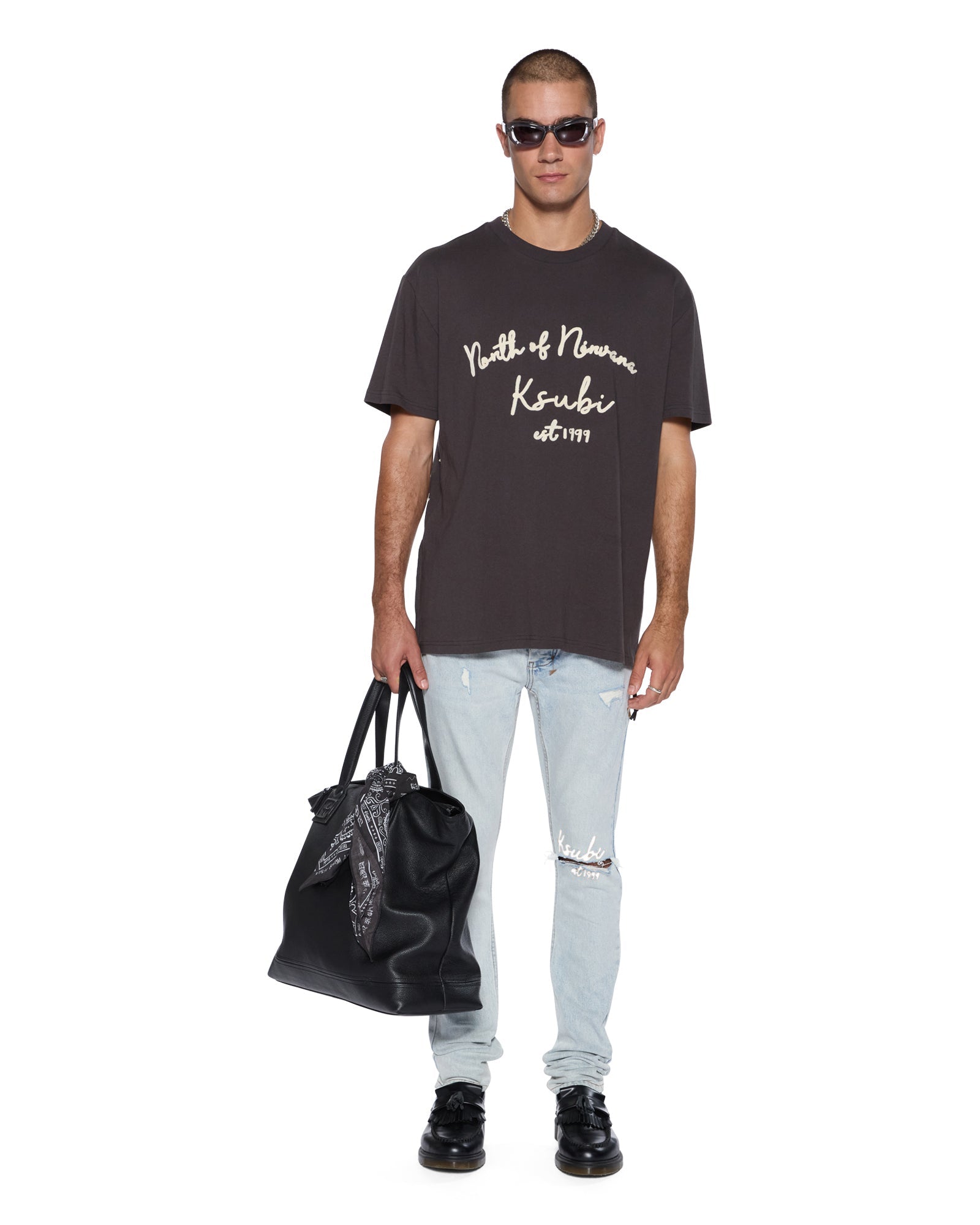 The Van Winkle Frost Blue Arch is a mid-rise, five-pocket, full-length skinny jean made from premium comfort stretch indigo denim with a heavy stone wash. Featuring unique angled belt loops, front fly seam details, and seasonal embroidery on the front and back, it is finished with T-box and 4x4 embroidery, ghost patching detailing, and Ksubi branded hardware.