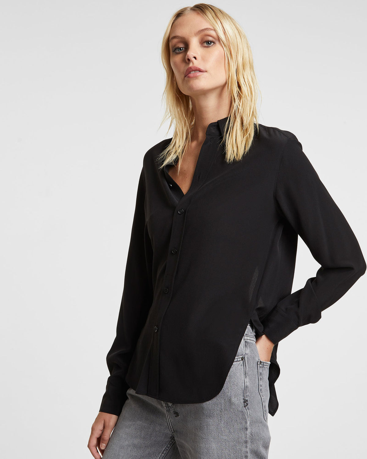 The Xzibit Shirt Black is a collar shirt with relaxed fit, long sleeve and curved hem. Made from a premium light-weighted 100% silk crepe in a black colourway. This style features mocked front button closure, back split, Ksubi logo back tie and Kusbi branding.